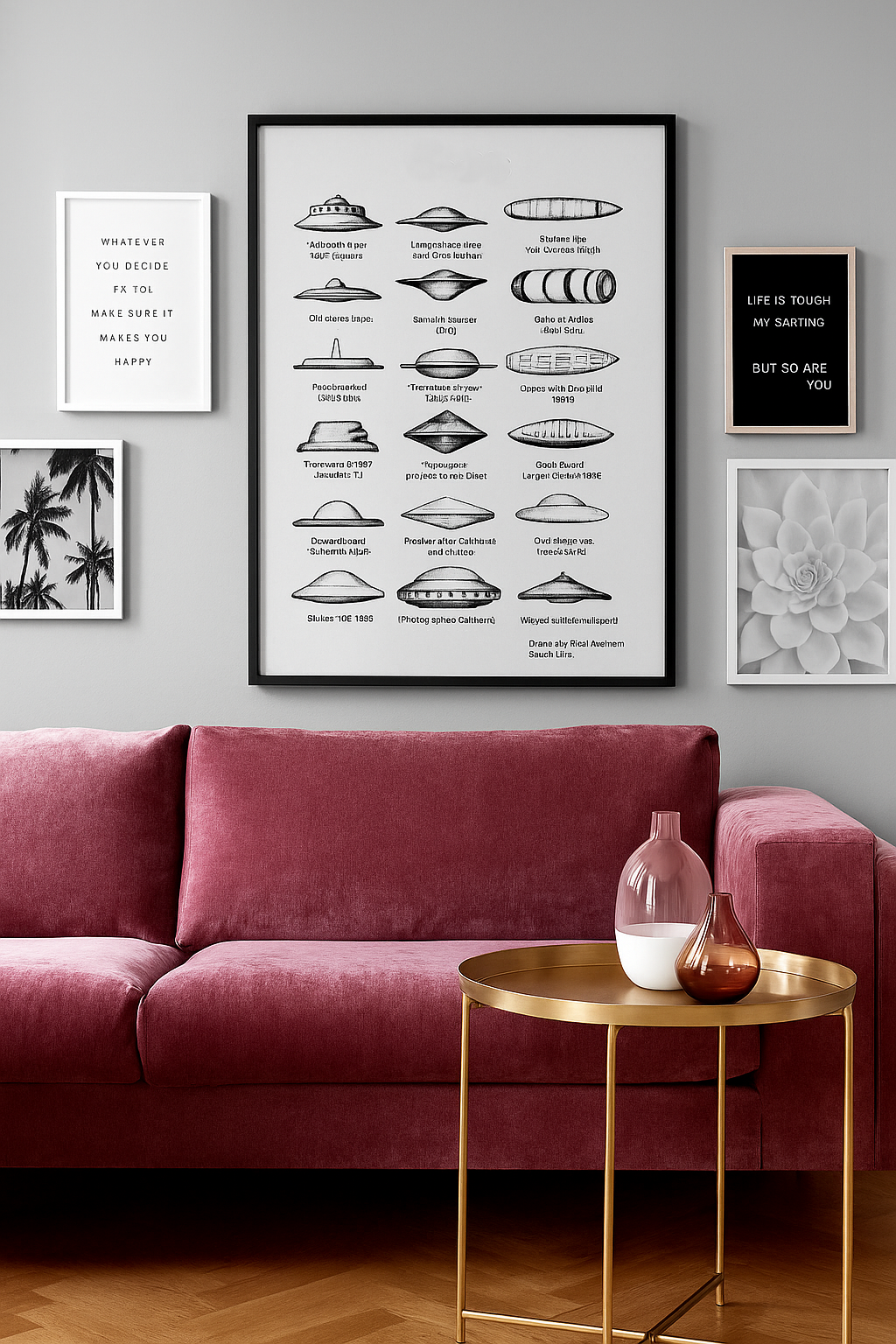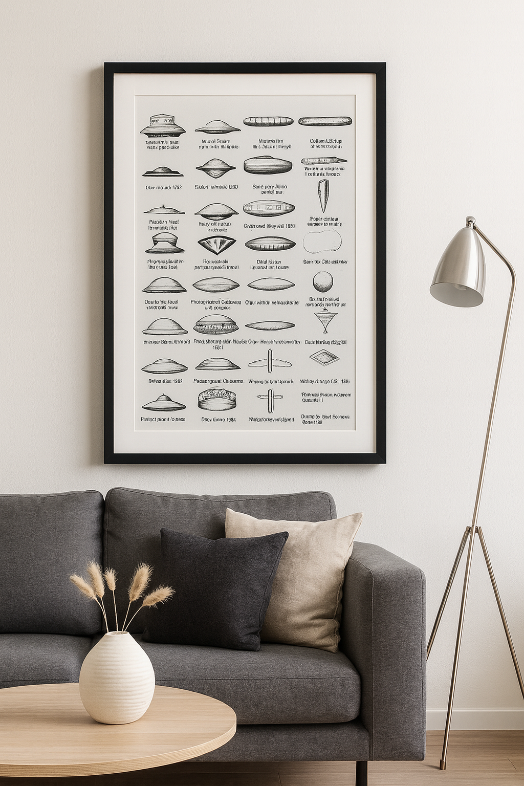 El diseño, conocido internacionalmente como “UFO Identification Chart 1967”, se ha convertido en un icono vintage que mezcla arte retro, misterio y cultura pop de mediados del siglo XX. Hoy lo presentamos en impresión de alta calidad y montado en un elegante marco, listo para decorar tu hogar, despacho o sala de coleccionista.
