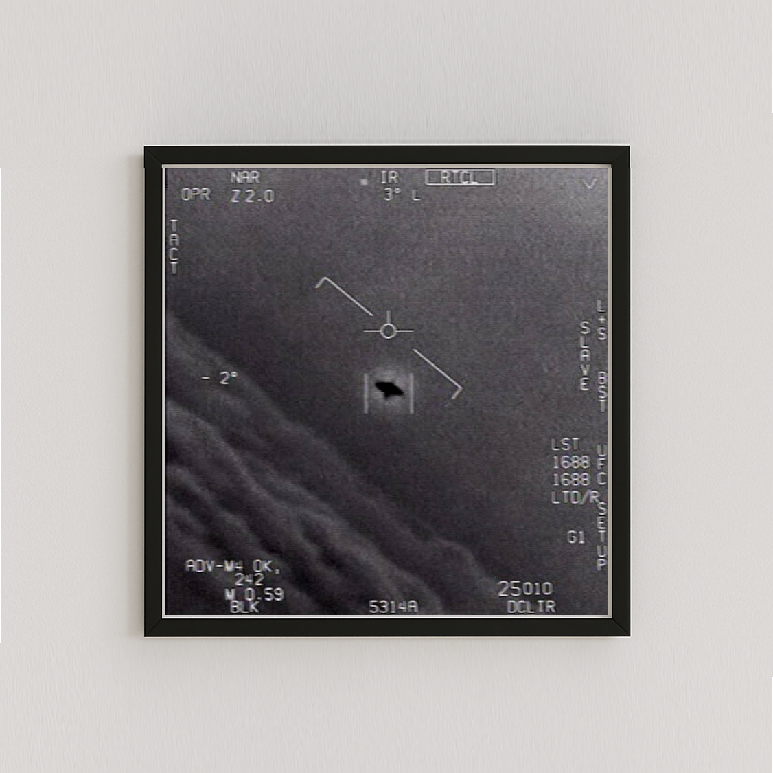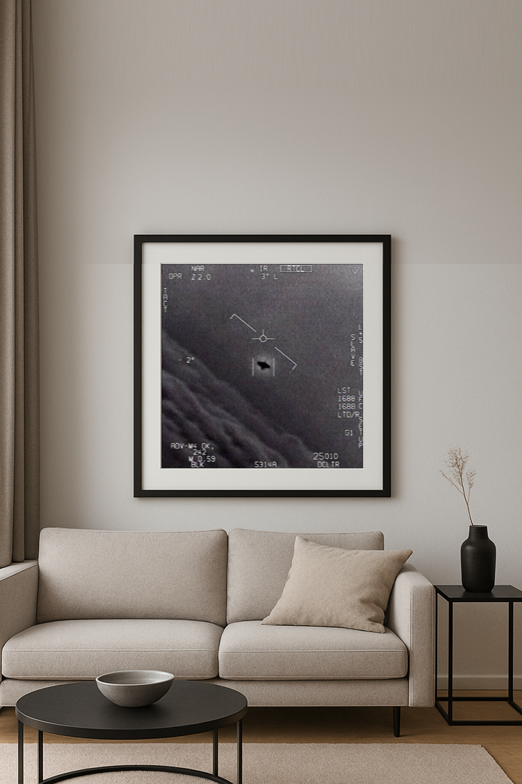 Lleva a tu pared un fragmento de historia contemporánea con este cuadro inspirado en uno de los episodios más enigmáticos de la aviación moderna. La imagen corresponde al famoso video “FLIR1”, registrado en noviembre de 2004 por pilotos de combate de la Marina de los Estados Unidos a bordo de cazas F/A-18 Super Hornet. Durante aquel encuentro, conocido como el incidente del USS Nimitz, varios aviadores experimentados fueron testigos de un objeto desconocido que se movía con maniobras imposibles, desafiando las leyes de la física y la tecnología conocidas.