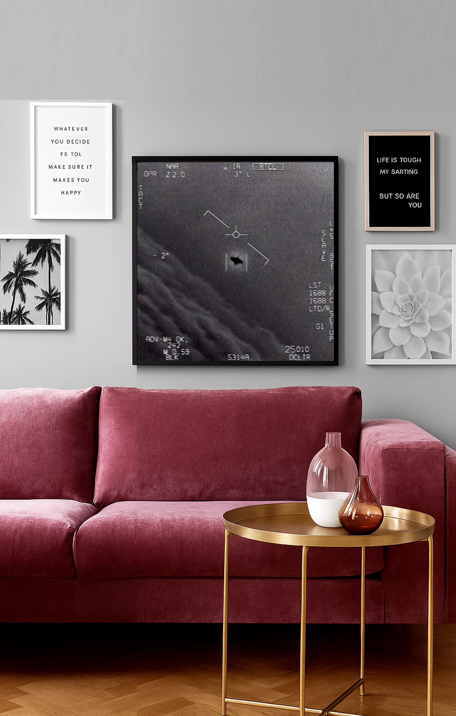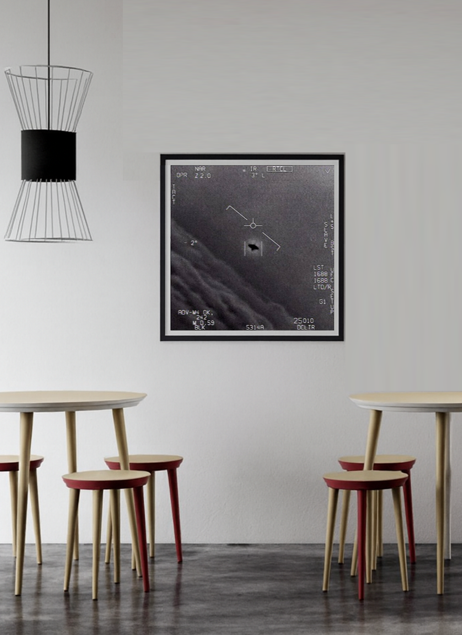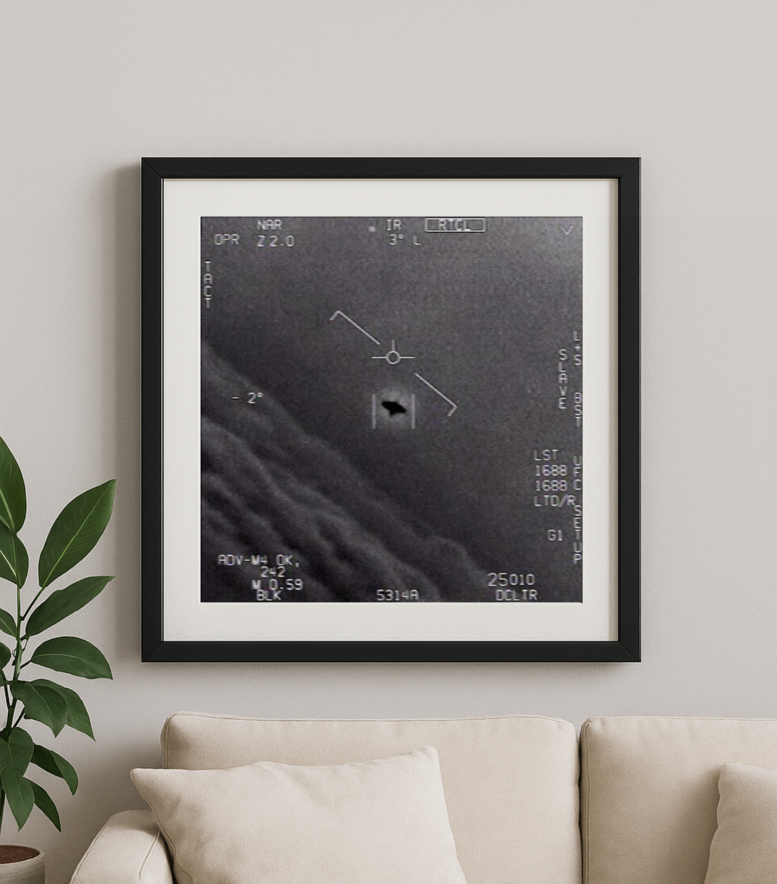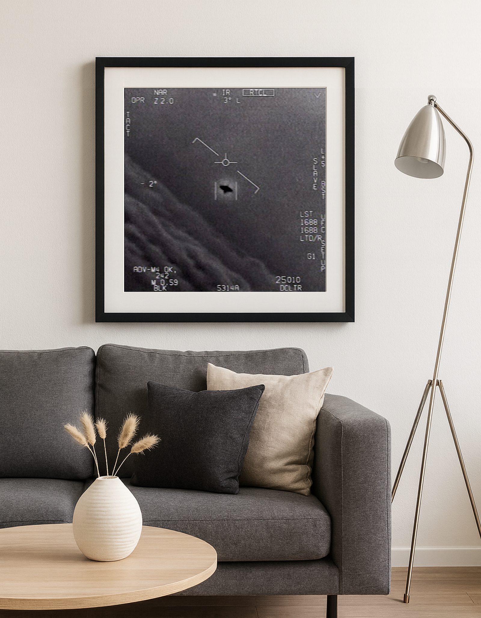 La captura muestra al objeto en el centro de la mira infrarroja, rodeado de información técnica y contrastado con un fondo de nubes. No es solo una fotografía en blanco y negro: es el símbolo de un misterio que hasta hoy sigue sin explicación oficial. Este cuadro decorativo convierte esa escena en una pieza de conversación, ideal para quienes buscan algo más que un simple adorno, aportando un aire intrigante, contemporáneo y lleno de carácter a cualquier estancia.